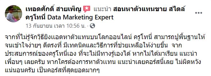 - ผู้สอนคอร์สสร้างระบบหาตัวแทน – สอนตัวแทนจำหน่ายแบรนด์ต่างๆ ในการสร้างระบบยิง ADS + SALEPAGE / Conversion หาคนสมัครตัวแทน